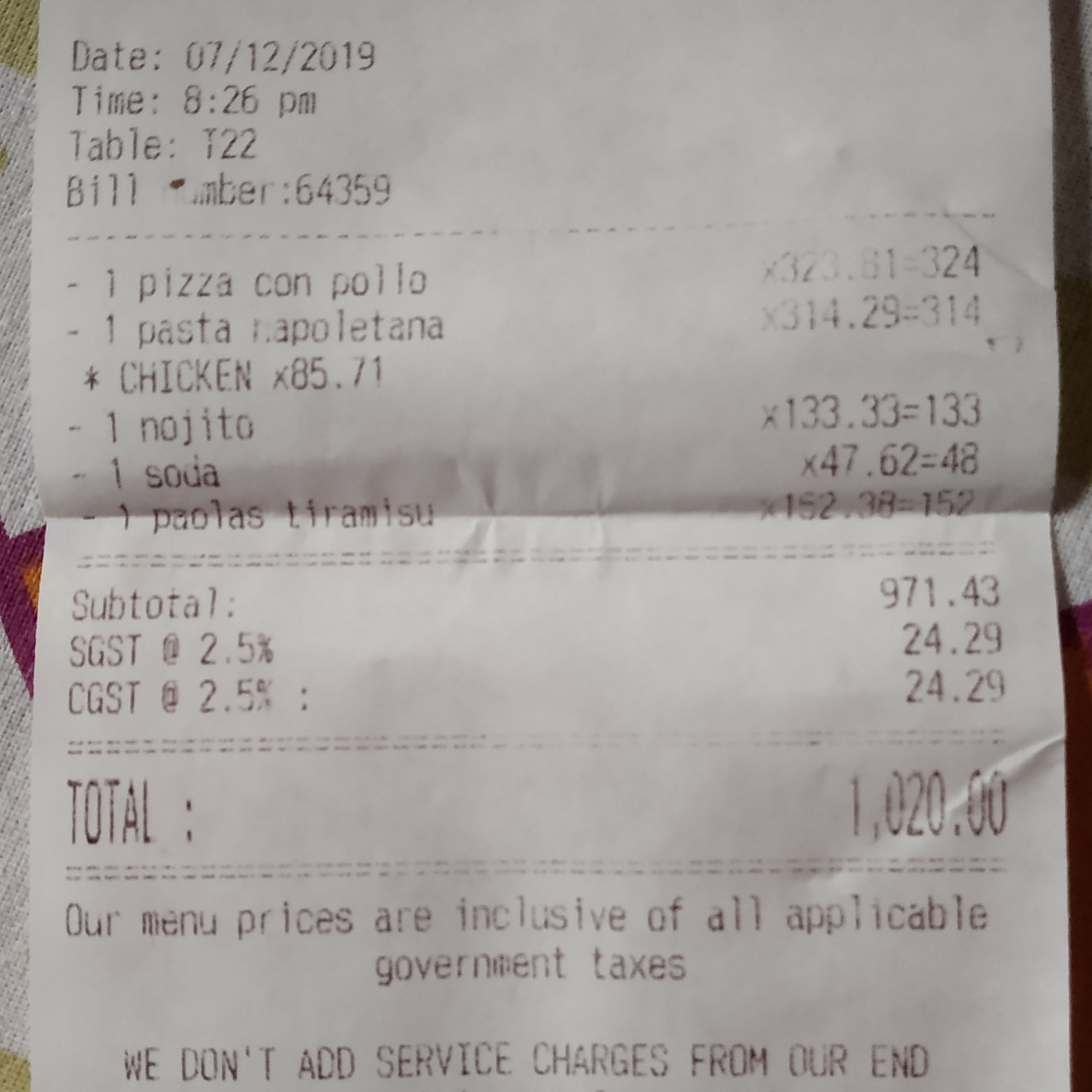 Post the beach time in the afternoon, we wanted to have something light. 😉 We found that this place being highly recommended in Zomato and was 5 mins walk from our hotel. So it was pizza and pasta time! This place has a rustic feel about the no frills decor. Service was prompt. We ordered Pizaa Con Pollo which had good dose of roast chicken and mozzarella. We loved it! Along with that, Sassy ordered a plate of Napoletana which was ok by my opinion! It was light and Rishaan had a good Pizza time! Not to miss, we still had appetite for some dessert and we ordered Tiramisu here. Bit strong on the coffee part, this provided the perfect ending for the dinner.
