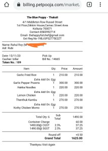 For what we ordered, it was perfect for 4 adults and a mini Monkey and it cost us INR 1625/-. Food delivery was done through Swiggy Genie – which has become a defacto norm, having never disappointed us.